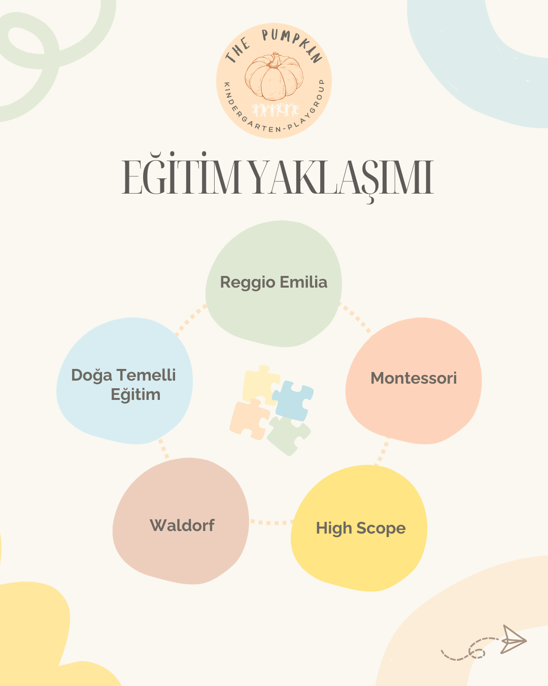 The Pumpkin Kindergarten’da eğitim yaklaşımımız; çocuğun aktif olduğu, öğretmenin rehberlik ettiği ve öğrenmenin günlük yaşamın içine yayıldığı bir sistem üzerine kuruludur. Programımız; çocukların öğrenme deneyimlerini oyun, ilişki, araştırma ve üretim süreçleriyle destekler.